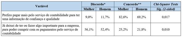 Constata-se que 82,6% das mulheres concordam que é preferível pagar mais pelo serviço de contabilidade, para ter uma informação de confiança e qualidade (somente 69,2% dos homens concordam com essa opção). Quando ocorrem dificuldades financeiras, o que, na hora de decidir, pode obrigar a escolher entre satisfazer um compromisso com um fornecedor ou com outro, o prestador do serviço de contabilidade pode sair prejudicado. Embora a maioria dos gestores não deixem de pagar o serviço de contabilidade em detrimento de outro fornecedor, um quarto das mulheres afirma privilegiar nestas situações os outros fornecedores.
