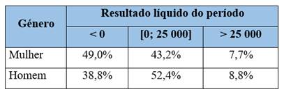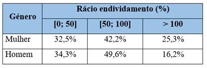 Numa última análise, procedeu-se ao cruzamento entre variáveis do vetor empresa com a variável género. Obtiveram-se dois resultados com nível de significância dentro do parâmetro admitido neste estudo, nomeadamente um p de 0,036 (ver Quadro 6), que evidencia uma relação entre o género e o endividamento da empresa e um p de 0,08 (ver Quadro 7), que associa o género ao resultado da empresa.