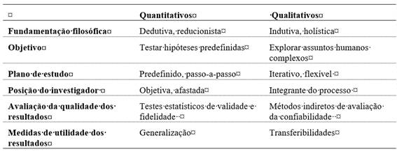 Não nos deteremos longamente na discussão da diferença entre investigação qualitativa e quantitativa. O leitor interessado poderá encontrar discussões sobre essa matéria, por exemplo, em Bryman (1984). Apresentamos um resumo das diferenças no Quadro 1.