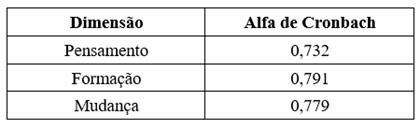 Além disso, para testar a confiabilidade das escalas foi feito o uso da técnica alfa de Cronbach, em que valores de no mínimo 0,6 são tidos como satisfatórios, e valores iguais ou inferiores a esse não possuem consistência interna suficiente (Malhotra, 2006). O resumo dos testes de confiabilidade para as três dimensões é apresentado no Quadro 1.