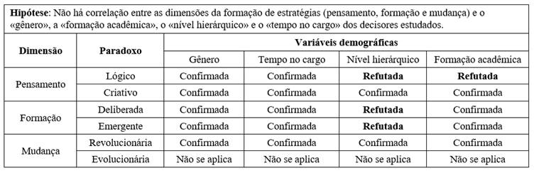 Portanto, em relação à hipótese testada neste estudo de que não há correlação entre as dimensões da formação de estratégias (pensamento, formação e mudança) e o «gênero», a «formação acadêmica», o «nível hierárquico» e o «tempo no cargo» dos decisores estudados, baseada no estudo de Lucian et al. (2008), tem-se que esta foi refutada, pois os resultados aqui obtidos apontam que há correlação entre o pensamento lógico e a formação acadêmica e nível hierárquico, assim como entre os fatores de formação deliberada e emergente com o nível hierárquico. O Quadro 2 apresenta um resumo das hipóteses testadas.