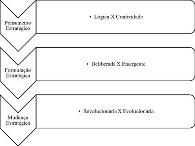 Estas dimensões são o pensamento estratégico, a formação estratégica e a mudança estratégica. Essas três dimensões consideradas implicam em algumas tensões entre pelo menos duas correntes de pensamento opostas e que precisam ser analisadas para que o processo estratégico como um todo possa ser compreendido (Lucian et al., 2008), como apresentado na Figura 1.
