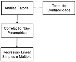 Para a análise dos dados foram utilizadas as seguintes análises multivariadas: análise fatorial e regressão linear. A primeira foi utilizada para captar as dimensões latentes que representam o conjunto de dados em um número menor de conceitos do que as variáveis individuais originais (Hair et al., 2005), assim como também foi realizado o teste de alfa de Cronbach para medição da confiabilidade, validade convergente e validade discriminante das escalas.