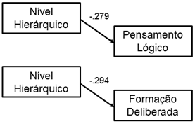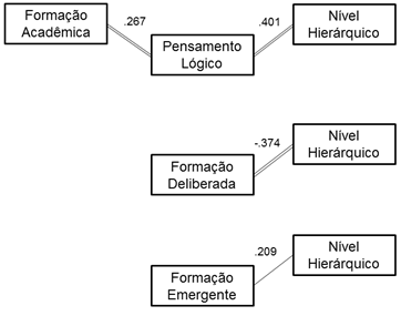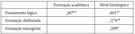 De acordo com os resultados apresentados na Tabela 1, pode-se afirmar que há correlação entre o pensamento lógico e a formação acadêmica e nível hierárquico e também entre os fatores de formação deliberada e emergente com o nível hierárquico. Estes primeiros resultados se assemelham em parte ao estudo de Lucian et al. (2008), em que a formação deliberada possuía uma correlação com o nível hierárquico.