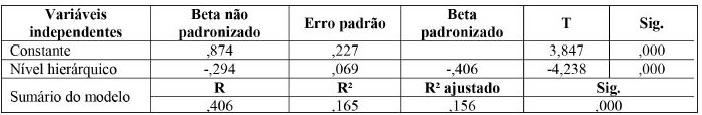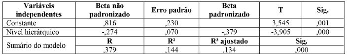 A segunda regressão foi realizada com a variável dependente de formação deliberada e a variável independente do nível hierárquico. A Tabela 3 mostra que o nível hierárquico tem relação inversa com a formação deliberada.