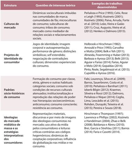 Assim, tais autores definem a CCT como uma tradição de pesquisa interdisciplinar que tem conhecimento avançado sobre a cultura do consumo (em suas manifestações heterogêneas) e tem gerado conclusões empiricamente fundamentadas e inovações teóricas que são relevantes para um conjunto de disciplinas relacionadas às ciências sociais ligadas a setores gerenciais.