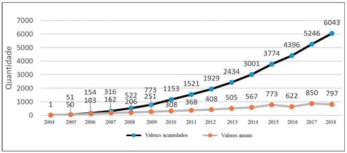 Morais e Quintão (2016) indicaram em seu estudo que o número de publicações em CCT, por pesquisadores brasileiros, em periódicos nacionais e estrangeiros, tem crescido substancialmente. O mesmo crescimento pode ser observado em pesquisas de autores brasileiros e estrangeiros, conforme ilustra a Figura 1.