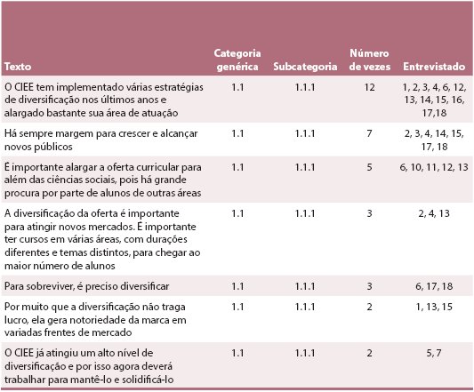 Ou seja, podemos concluir, pela análise de conteúdo das entrevistas realizadas e no Quadro 2 e Quadro 3, que, de fato, e tal como afirmam Lo e Hsu (2016), a implementação de estratégias de diversificação pode qualificar-se como um modo de operação alternativo e viável, utilizado pelas organizações para dar resposta às necessidades do mercado e de seus clientes, de maneira a aumentar o desempenho das empresas. É ainda possível concluir, pelas entrevistas realizadas e tal como sugerido pela literatura, que o uso de estratégias de diversificação traz bastantes benefícios para a organização, e o CIEE poderá usufruir de vários deles, nomeadamente aumentando sua vantagem competitiva e sustentabilidade, buscando sinergias operacionais e ainda aumentando seu poder de mercado ao criar valor adicionado, como defendem os autores estudados (ALI, HASHMI e MEHMOOD, 2016; HASHIM e KOON, 2017; LO e HSU, 2016).