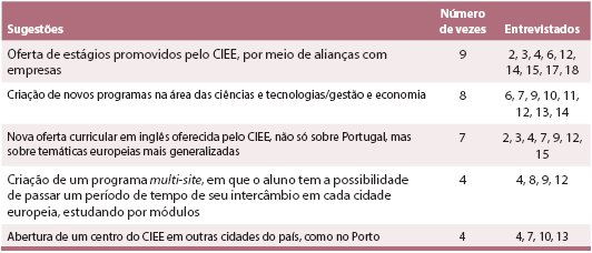 Nesse seguimento, outra das sugestões prende-se ao alargamento de um estudo desse calibre a outros centros urbanos onde o CIEE opera, podendo até vir a estabelecer-se alguma relação de causalidade e transversalidade pela comparação de variáveis entre localizações geográficas. Seria ainda importante avaliar e estudar mais detalhadamente a necessidade de maiores investimentos no setor da educação pública portuguesa, no sentido de fomentar a criação de uma oferta curricular lecionada em inglês mais rica e abrangente, que consiga suprir as necessidades acadêmicas dos estudantes internacionais. Por fim, estudos futuros poderão ainda considerar o recurso a uma componente quantitativa quando da escolha da metodologia utilizada.