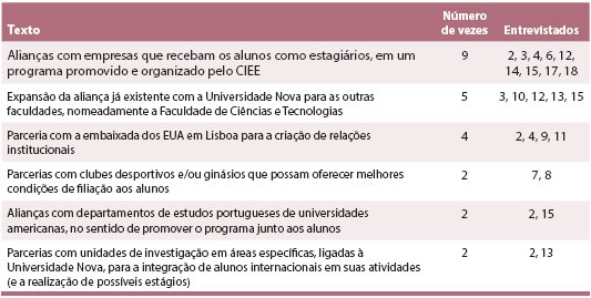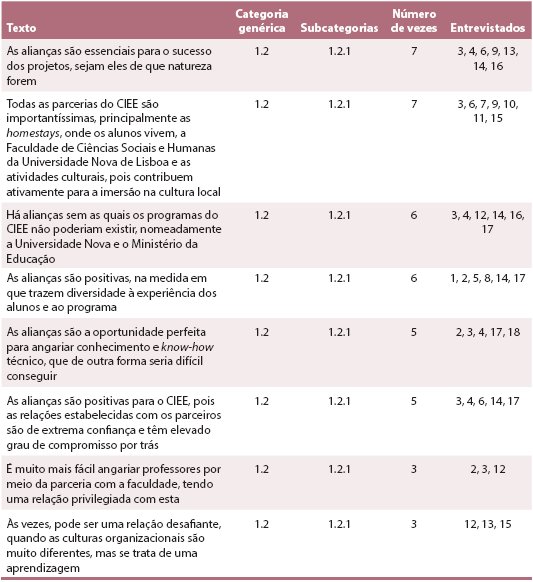 Analisando o Quadro 5, é possível verificar que as alianças são, de fato, vistas pelos colaboradores da empresa como algo extremamente positivo e que contribui para o enriquecimento da oferta de produtos e serviços dinamizados pelo CIEE. Tal como defendem os autores, os entrevistados confirmam, em seus testemunhos, que as alianças permitem à empresa aceder a recursos, competências e mercados que de outra forma seriam difíceis de alcançar, bem como preencher possíveis lacunas na linha de produto, por meio do know-how especializado dos parceiros (GOERZEN, 2007; LAZZARINI, BRITO e CHADDAD, 2013; VARADARAJAN e CUNNINGHAM, 1995). Um exemplo disso é a importância que os entrevistados atribuem à relação privilegiada que o CIEE tem com a Universidade Nova e o Ministério da Educação, elegendo essas parcerias como fator crucial para o sucesso do programa. Outras vantagens prendem-se ao fato de as alianças representarem uma forma econômica e flexível de lidar com a instabilidade dos mercados, oferecendo uma resposta maleável às solicitações destes (ALDAKHIL e NATARAJA, 2014; DAY, 1995).