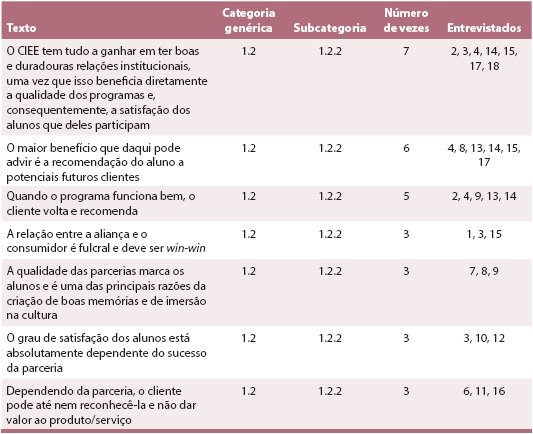 A quarta questão de pesquisa foi motivada fundamentalmente pelos estudos de McSweeney-Feld, Discenza e De Feis (2010), em que os autores defendem que, apesar de as alianças estratégicas serem proveitosas para seus parceiros, por meio da partilha de recursos e conhecimento, o principal objetivo delas é fornecer produtos e serviços ao cliente, uma vez que, em última instância, se não houver um comprador interessado, a aliança corre o risco de se extinguir. Desse modo, o cerne dessa questão foi apurar se a formação de alianças estratégicas por parte do CIEE com outras entidades tem impacto positivo na relação com o consumidor, bem como em seu grau de satisfação. No Quadro 7, é possível explorar os principais inputs dos entrevistados.