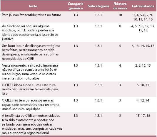Entre as várias razões apresentadas pelos colaboradores para o fato de o CIEE não dever enveredar por uma estratégia de F&A, salienta-se a potencial perda de identidade e autonomia que daí poderia decorrer, bem como a pequena dimensão da empresa em Lisboa. Outro dos fatores apresentados são os elevados custos inerentes aos processos de F&A e que, nesse caso, não compensam os benefícios adjacentes, vindo, desse modo, reforçar as ideias defendidas nos estudos de Marks e Mirvis (2011).