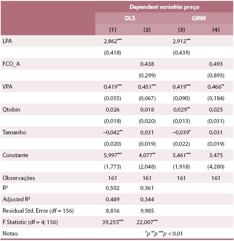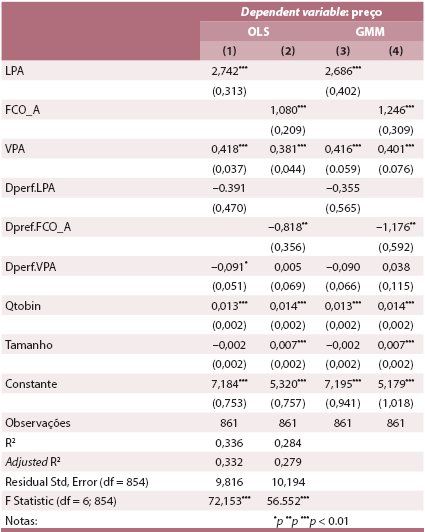 Em outras palavras, esses resultados sugerem que, embora o LPA tenha apresentado maior relevância do que o FCO_A para explicar o preço das ações ordinárias, o FCO_A é mais informativo para o preço das ações ordinárias do que em relação à classe de ações preferenciais. Assim, no conjunto das análises, observa-se que há indícios para a não rejeição de H1. Além disso, esses resultados fazem com que a H2 não seja rejeitada, ou seja, têm-se evidências de que o LL é mais relevante para as ações preferenciais do que para as ações ordinárias. Isso é demonstrado pela significância apenas do LPA (e não do FCO_A) e pelo fato de o R2 do modelo com LPA ter sido superior ao R2 do modelo com FCO_A. Além disso, o R2 do modelo da variável LPA para ações preferenciais é superior ao R2 do modelo 3 LPA para ações ordinárias. Percebe-se que o teste de robustez estimado por GMM confirma os achados discutidos sobre as estimativas obtidas por OLS.
