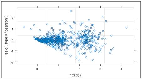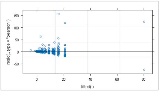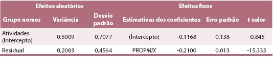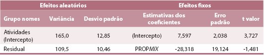 Na condição de modelos mistos para a execução da regressão, para a transformação das variáveis e as análises, como os outliers, fez-se uso do software R, bem como do pacote “lme4” e da função de regressão “lmer”, conforme os modelos nominados como m1 (m1<-lmer(PESOS ~PROPMIX + (1| ATIVIDADES), data=Mixmensal) e m2 (m2<-lmer(log(PESOS+1)~log(PROPMIX)+(1|ATIVIDADES), data=Mixmensal).