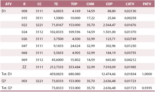 Diante da representatividade da atividade D1, ao longo do período estudado, esta passa a ser considerada a atividade base (padrão) para o estabelecimento dos pesos, e recebe o peso 1,000. Por outro lado, a atividade Q7 apresenta um custo total de R$ 2.636,48 para a execução de 153.000 operações/atividades o que resulta num custo unitário de R$ 0,01723. Com base nesses valores, formou-se o peso dessa atividade para o mês analisado, qual seja R$ 0,01723 dividido pela atividade base D1 de custo R$ 0,01834 cujo peso atribuído para Q7 - fechar anel prensa giratória é de 0,9395. Assim, a execução da atividade Q7 equivale a 0,9395 da atividade D1.