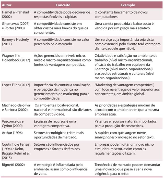A competitividade se traduz na conquista de vantagens competitivas que, de acordo com Hamel e Prahalad (2002), decorrem de capacidades essenciais da organização, como desempenhar diferentes atividades de produção e usar tecnologias. Ghemawat (2007) e Porter (2004) destacam a vantagem competitiva decorrente de custos inferiores aos dos concorrentes. Barney e Hesterly (2011) propõem que a vantagem competitiva decorre de diferenciação em valor, raridade, dificuldade de imitação e capacidade de organização como recursos que proporcionam maior valor percebido pelo cliente e aumento da lucratividade.