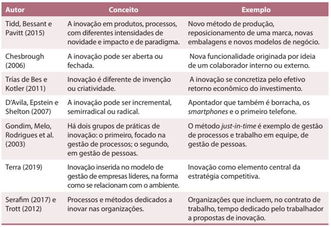 A visão de Serafim (2017) também se baseia na capacidade de inovação decorrente de aspectos culturais, mas acrescenta a descrição de processos e métodos organizacionais que a favorecem. Já a proposição de Trott (2012) se caracteriza como um olhar voltado a processos e métodos dedicados a inovar nas organizações.