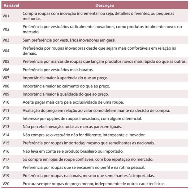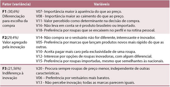 Para o uso de análise fatorial considerou-se ser possível identificar fatores que caracterizam aspectos que os participantes da amostra consideram relacionados à inovação em sua preferência de compra de peças de vestuário. Efetuou-se, assim, uma análise fatorial exploratória, considerando que as definições não foram identificadas preliminarmente.