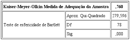 Para testar a significância, recorreu-se ao teste de esfericidade de Bartlett. Para Malhotra (2001), esse teste se destina a verificar se a hipótese de que as variáveis utilizadas na análise fatorial não são correlacionadas, estabelecendo que deve ser significativa em nível de 95%, ou seja, menor do que 0,05. Também necessária e recomendada por Hair Junior, Black, Baibn et al. (2009), considerou-se a medida de adequação da amostra de Kaiser-Meyer-Olkin (KMO).