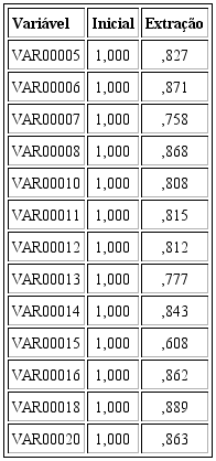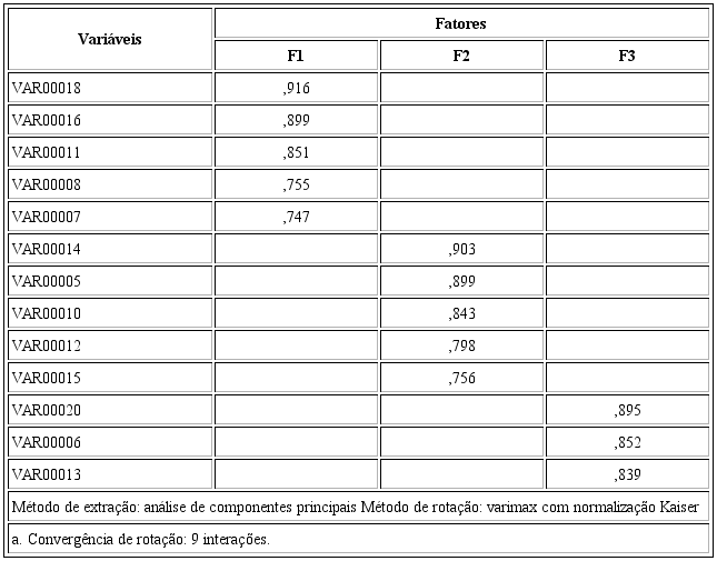 Para essa análise foram consideradas, inicialmente, todas as variáveis apresentadas no Quadro 4. Analisando a matriz anti-imagem de correlação bivariada resultante desse primeiro processamento, observou-se que as variáveis V1, V2, V9 e V19 não apresentaram correlações significativas com as demais. Desse modo, foram excluídas da análise fatorial.
