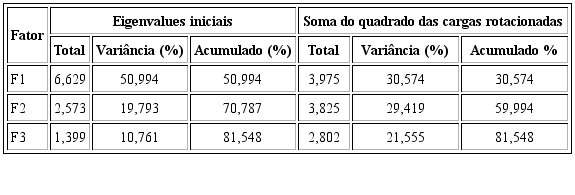 Considerando significativos os autovalores (eigenvalues) superiores a 1,0, foram identificados 3 fatores explicando 81,548% da variância, como mostram as Tabelas 3 e 4.