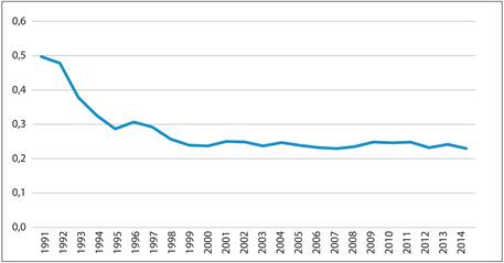 Conforme mostrado na Figura 1, a tangibilidade caiu com o passar dos anos, estabilizando-se depois dos anos 2000 na faixa dos 23%. Assim, neste trabalho mostramos que a teoria desenvolvida por Rajan e Zingales deve ser atualizada, para refletir a perda de importância da tangibilidade do ativo na capacidade da firma de se alavancar.