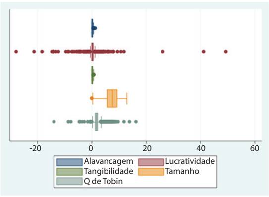 A Tabela 1 mostra a estatística descritiva de nossa amostra. A amostra contém muitos outliers (Apêndice, Figura A.1), como pode ser visto pelo fato de a lucratividade ter uma média próxima a zero e desvio-padrão próximo a dois, mas ter os valores extremos de -27,7 e 49,55. Assim, vamos winsorizar os dados nos percentis de 5% e 95%, para diminuir o efeito da longa cauda de nossa amostra.