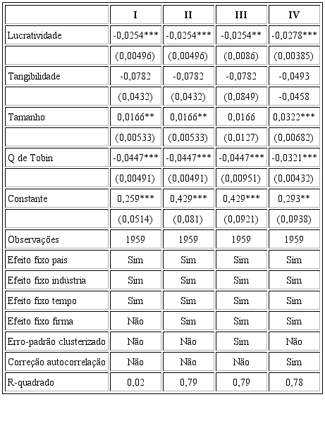 Os resultados estão em linha com os encontrados por Rajan e Zingales (1995). Lucratividade e alavancagem estão negativamente correlacionadas. O raciocínio por detrás desse resultado é que, em períodos de maior lucratividade, as firmas que já contam com pagamento de dividendos e investimentos fixos utilizam esse adicional para diminuir sua alavancagem, usando, assim, capital próprio para seus investimentos.