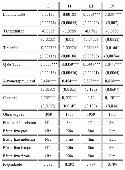 Além disso, ainda testamos a proposição de Lemmon, Roberts e Zender (2008), expondo que, mesmo que a alavancagem inicial seja colocada no modelo, os resultados mantêm-se praticamente inalterados. Assim, a persistência da alavancagem no tempo não afeta os resultados inferidos pelo modelo de Rajan e Zingales (1995).