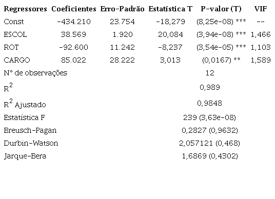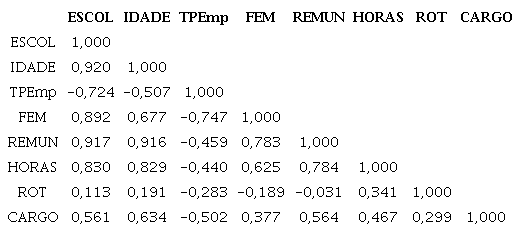 Segundo Appolinário (2006), uma correlação que apresenta valor igual ou maior que 0,600 pode ser considerada forte. Assim, com base nessa matriz de correlação, selecionou-se a variável ESCOL para compor o modelo, bem como as variáveis ROT e CARGO. Não foram inseridas no modelo as variáveis que apresentavam correlação maior que 0,600, em módulo, com a variável ESCOL.