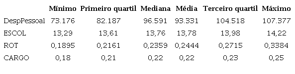 Preliminarmente à estimação dos parâmetros do modelo de regressão, foi elaborada a matriz de correlação entre as variáveis, conforme a Tabela 3. Esperavam-se associações positivas entre a variável DespPessoal e as variáveis independentes.