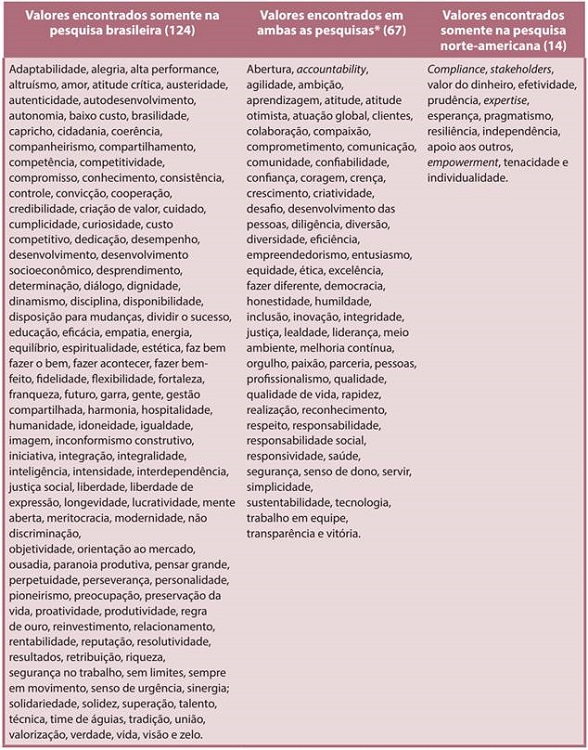Há uma taxa de coincidência - valores encontrados nas pesquisas internacional e brasileira, respectivamente - de 32,7%, baixa o bastante para indicar que, embora a elaboração de DVs como instrumento de gestão tenha se disseminado para a cultura empresarial nacional - dada a presença de DV em 62,2% das empresas -, os valores em si não são universalizáveis. Apesar de ser um elemento que também aponta para a necessidade de pesquisas adicionais, esse achado condiz com a perspectiva de apropriação da literatura internacional por parte da literatura e da prática nacional. Wood Junior, Tonelli e Cooke (2011) analisaram o assunto do ponto de vista da literatura de recursos humanos, demonstrando como houve períodos de colonização, neocolonização e pós-colonização, com o desenvolvimento de abordagens genuinamente brasileiras.