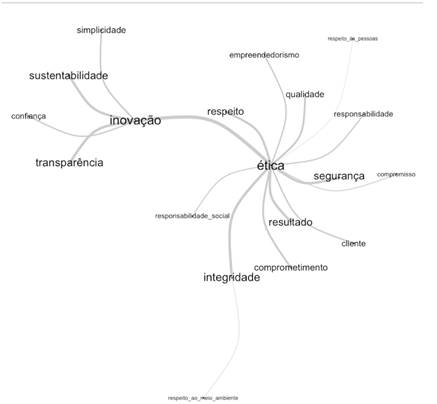 Os termos mais frequentes delimitam dois grandes campos semânticos, em torno dos termos “ética” e “inovação”, conforme apresentado na Figura 2. A preocupação com a ética - ética (114), integridade (71), transparência (66), respeito (61), responsabilidade (33) e compromisso (28) - revela uma disposição à adoção de comportamentos moralmente aceitáveis, seja no âmbito interno, seja no externo. Não obstante sua amplitude semântica, sobretudo no campo filosófico, o termo “ética” costuma se referir a um dever ser adequado, em sintonia com o conceito metafísico do bem. Integridade se refere à qualidade do que é inteiro, ou seja, o comportamento único e autêntico, focado num só interesse, que é alcançar aquele dever ser estipulado pela ética - para ser ético é preciso ser íntegro. Transparência remete à ausência de interesses ou práticas ocultas - quando se é ético e íntegro, não há nada a esconder. Respeito (deferência, consideração), responsabilidade (responder por algo) e compromisso (acordo, promessas mútuas) articulam um segundo subcampo conectado ao termo “ética”, mais afeito às práticas relacionais das empresas em relação aos seus diferentes públicos.