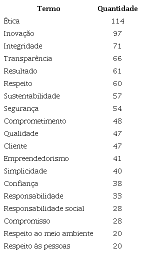 No que concerne à agregação dos valores, foi possível identificar pela pesquisa que as maiores empresas brasileiras estão preocupadas com ética e inovação. Passados sucessivos escândalos de corrupção envolvendo empresas do país, é benfazejo verificar que, ao menos do ponto de vista discursivo-normativo, as companhias nacionais buscam um comportamento ético. Mesmo diante de notórias dificuldades - como complexidade regulatória, emaranhado de impostos, políticas públicas discricionárias e fracamente articuladas etc. -, as empresas compreendem a inovação como o caminho para a sobrevivência.
