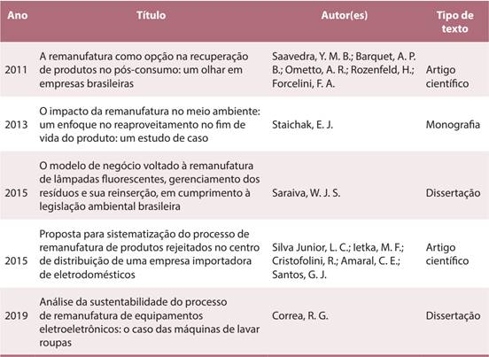Com base em um estudo exploratório na literatura científica, Saavedraa, Barqueta, Ometto et al. (2011) identificaram as principais características da remanufatura, adotando dois estudos de caso - um Fabricante Original do Equipamento e uma empresa independente. Esse estudo possibilitou ainda uma análise em termos comparativos dos aspectos críticos observados nas duas empresas e indicou que a Fabricante Original do Equipamento possui maiores vantagens em itens como: relacionamento com os fornecedores do produto usado, logística reversa, operação de remanufatura e comercialização do remanufaturado. Neste caso, os autores ressaltam a possibilidade de parceria entre estas empresas para o alcance de ganhos maiores na recuperação dos produtos usados. No Quadro 1, estão listados os trabalhos aqui citados.