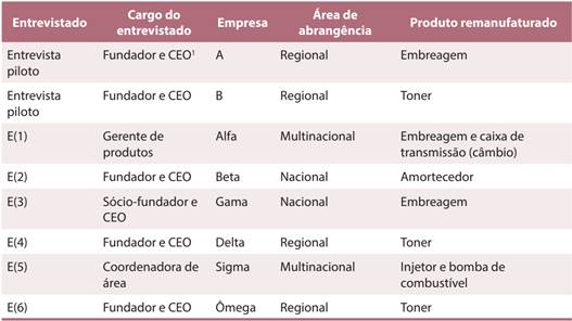 A amostra foi escolhida por acessibilidade, e o critério de aceite para participar da pesquisa residia na conformidade da atividade com a remanufatura. Ou seja, o processo em si conta com várias etapas que incluem desde a desmontagem até os testes. Destarte, dependendo do processo descrito previamente, a prática condizia com outras existentes utilizadas para a recuperação de produtos usados, tais como: reparo, recondicionamento etc. Assim, das 22 (vinte e duas) organizações consultadas via e-mail e telefone, somente 08 (oito) foram selecionadas: 02 (duas) para entrevistas piloto e 06 (seis) para entrevistas definitivas. No Quadro 2, constam maiores detalhes a respeito das entrevistas semiestruturadas colhidas.