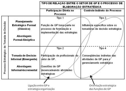 A participação das unidades de GP no processo decisório das organizações pode ser compreendida pela perspectiva formal-sinóptica ou informal-incremental (BREWSTER, LARSEN e MAYRHOFER, 2000). Na primeira, a tomada de decisão organizacional é um processo deliberado, no qual há uma divisão sequencial de formulação e implementação da estratégia. Assim, a participação do setor de GP no processo estratégico se dá de forma direta, por meio do acesso regulamentado às arenas decisórias organizacionais. Na segunda, a tomada de decisão ocorre por um processo interativo com várias retroalimentações, no qual as ecisões se dão sem divisões e a estratégia se desenvolve de maneira incremental, tornando-se visível na sua implementação, de maneira que a participação do setor de GP no processo decisório acontece pelo acesso não regulamentado aos membros componentes das arenas decisórias organizacionais (Figura 1).