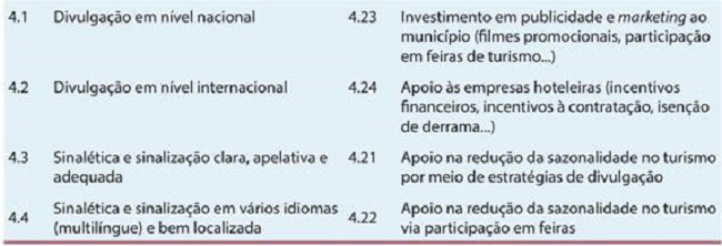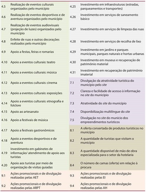 Com base nos valores obtidos, foi ainda necessário proceder a alguns ajustes. Assim, efetuaram-se as seguintes correlações: entre os itens 9.1 e 9.2 (15%); 4.1 e 4.3 (31%), uma vez que se podem considerar a sinalética e sinalização existentes nos municípios como uma componente de divulgação dos pontos de interesse para o turista; entre os itens 4.16 e 4.18 (11%), que relaciona os apoios a festivais de música e os apoios a eventos de cariz desportivo e de aventura; e entre os itens 8.1 e 8.3 (-25%), com a indicação de que a oferta consertada de produtos turísticos influencia negativamente a quantidade de mão de obra especializada no setor hoteleiro, levando à dispersão da mão de obra por várias áreas ligadas ao turismo, muitas vezes em regiões onde a mão de obra é escassa.