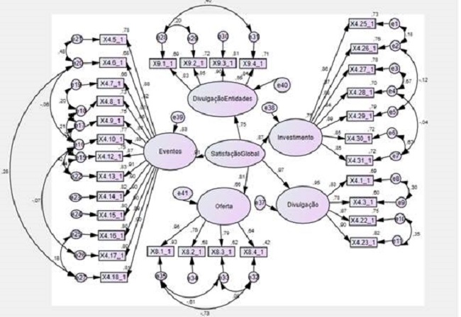 Adicionalmente, segue-se uma mais perceptível explicação dos impactos dos vários fatores na variável dependente SG. De acordo com as estimativas não estandardizadas e uma vez que todos os impactos são positivos, quanto maior for, por exemplo, o apoio que o município dá à realização de eventos, maiores serão os níveis de satisfação dos respondentes. O mesmo se aplica aos restantes fatores constituídos. Quanto às estimativas estandardizadas (Figura 2), consegue-se perceber, no âmbito da componente da medição, qual o fator que tem uma maior população (lobby) relativamente à VL “satisfação global”. Neste caso, é a “Divulgação” que tem maior contribuição, pois explica 95% da variabilidade da SG seguida da variável “Eventos”, com 83%.