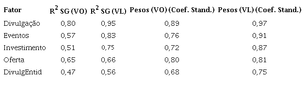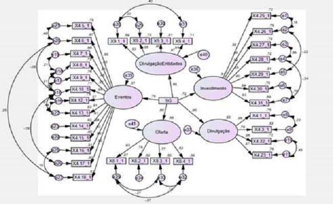 Igualmente, todos os coeficientes padronizados de correlação múltipla relativos às VL (fatores) que contribuem para o constructo “SG” apresentam valores de R2 elevados, expressando a elevada percentagem de variância explicada por cada fator e o quão importante é o fator. Conforme se pode constatar, é o fator “divulgação” que apresenta o coeficiente mais elevado, seguido de “eventos” - os valores de R2 podem ser observados na Figura 2 ou na Tabela 8, coluna “R2 SG (VL)”.