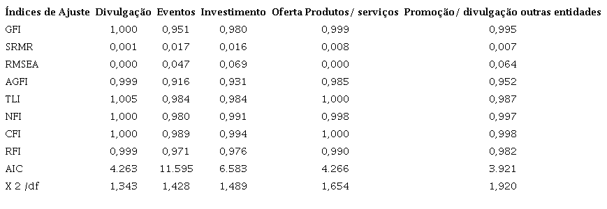 Com o objetivo de validar o modelo, o primeiro passo refere-se à componente medição que permite operacionalizar as VL. Da análise às cargas fatoriais de cada item, e como todos contribuíam de forma positiva (acima de 68%) para a construção de cada uma das VL, não houve necessidade de eliminação de nenhum outro item, para além dos anteriormente mencionados. Contudo foi necessário efetuar correlações entre vários erros de medida na construção das diversas VL. Foi igualmente necessário repensar o modelo, uma vez que a VL “site” não apresentava índices de ajuste aceitáveis. Neste caso, duas hipóteses se colocavam: (1) eliminar esta VL ou (2) considerar os itens 7.3; 7.4 e 7.5 impactando positivamente na VL “Divulgação”. Comparados os valores dos índices resultantes das duas hipóteses, estes se adequavam mais à hipótese (1), levando à eliminação total dos itens subjacentes à variável “Site”.
