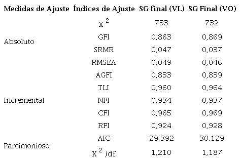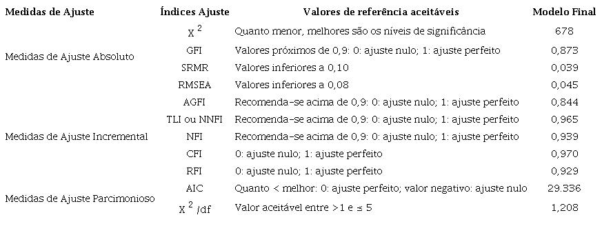 Uma vez que cada VL foi examinada per si, o modelo inicial e o modelo final apresentaram valores muito semelhantes para os índices de ajuste. Os valores referentes ao modelo final apresentam-se na Tabela 2 e podem ser considerados razoáveis/bons.