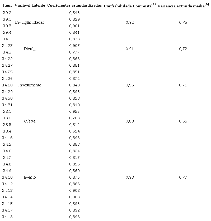 De acordo com a AFC e uma vez que o modelo de medida mostra consistência com o modelo teórico, é possível concluir que efetivamente as diversas VO representam as medidas para as cinco VL construídas. Da análise aos valores da Tabela 3, constata-se que a confiabilidade composta é superior a 0,88 para todas as VL, o que é um bom indicador (FORNELL e LARCKER, 1981).
