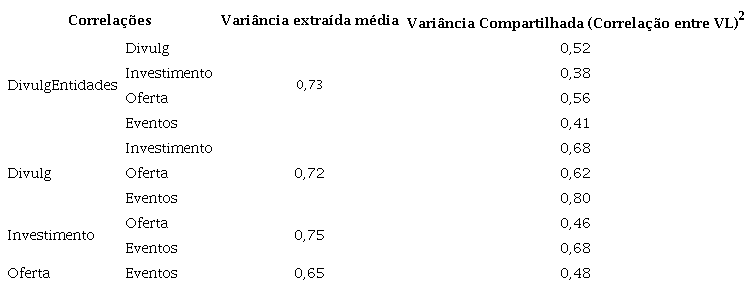 Recorrendo ao método de Fornell e Larcker (1981), verificou-se que os valores obtidos para a VEM são superiores aos obtidos para o quadrado do coeficiente de correlação das VL (variância compartilhada), o que é indicativo da existência de validade discriminante (Tabela 4). Esta validade das VL permite perceber se as questões foram compreendidas pelos respondentes como um conjunto homogêneo (MATTOZO, 2014).