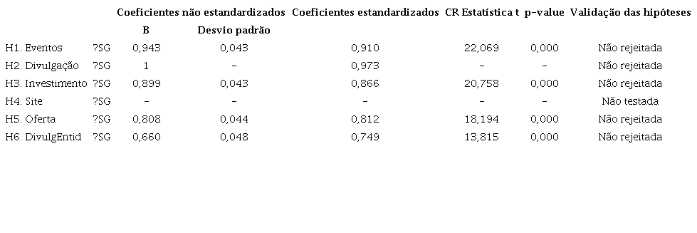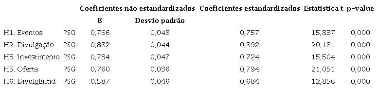 Ainda de acordo com os valores apresentados na Tabela 6, todas as hipóteses inicialmente colocadas foram validadas. A hipótese H4 tinha sido retirada por impossibilidade de ser testada individualmente, conforme anteriormente explicado.