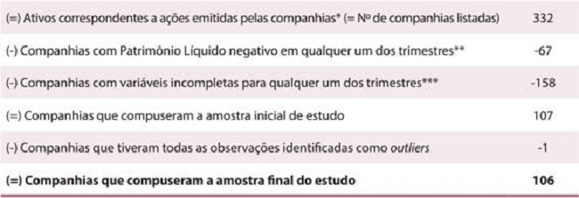 Com os critérios de seleção, a amostra inicial do estudo foi composta por 107 companhias, das quais foi possível obter 4.280 observações. Contudo, como a análise multivariada utilizada para cumprir o objetivo do estudo é baseada em médias, os dados discrepantes podem distorcer a interpretação dos resultados. Por esse motivo, submeteram-se os dados ao teste multivariado de Hadi (1992), com objetivo de rastrear observações discrepantes. Tal teste detectou a presença de 348 observações classificadas como outliers. Esses dados discrepantes pertencem a diferentes companhias da amostra - das 106 empresas, 55 companhias possuíam, ao menos, uma observação discrepante.