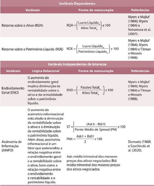 A pesquisa utiliza duas variáveis dependentes (retorno sobre o patrimônio líquido e retorno sobre o ativo) e duas variáveis independentes de interesse (endividamento geral e assimetria da informação). Além disso, tem-se variáveis independentes de controle, conforme apresentado no Quadro 2.