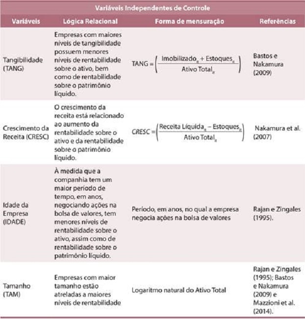 Em que: ROA = rentabilidade sobre o ativo da empresa i no período t; ROE = rentabilidade sobre o patrimônio líquido da empresa i no período t; END = endividamento total da empresa i no período t; AINFO = assimetria informacional da empresa i no período t; TANG = tangibilidade do ativo da empresa i no período t; IDADE = horizonte temporal em que a empresa i no período t negocia ações no mercado de capitais; TAM = tamanho da empresa i no período t.