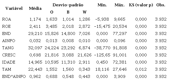 Por causa do efeito nocivo dos dados discrepantes, optou-se pela exclusão de todos os outliers. Ressalta-se que todas as observações de uma empresa tiveram seus dados excluídos por serem classificados como discrepantes. Assim, a amostra final foi composta por 3.932 observações (92% da amostra inicial) correspondentes a 106 empresas. A opção pela exclusão das observações outliers levou à conversão do painel balanceado em um painel desbalanceado, como sugerido por Fávero e Belfiore (2017).