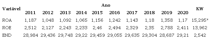 Mesmo que o endividamento geral, rentabilidade do ativo e rentabilidade do patrimônio líquido apresentem resultados similares quando comparados com investigações anteriores, vale ressaltar que o comportamento dessas variáveis demonstrou uma baixa oscilação ao longo do tempo, como apresentado na Tabela 2.